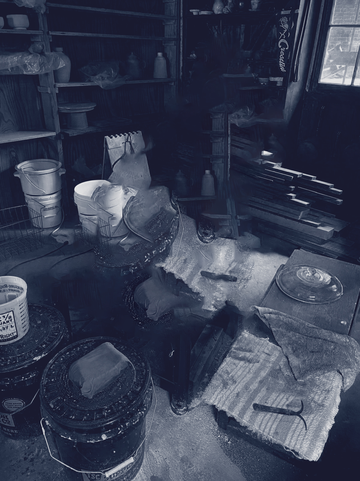 Clay didn’t find me again until 2021, living in the protected lands of the Wild and Scenic Amargosa River, the river that terminates at Badwater Basin in Death Valley, the world’s hottest place, the United States’ lowest point of elevation, without cell service, off-grid. I had a motorcycle, a few changes of clothes, several buckets and a shovel, and a few liters of water. I hiked into the badlands behind China Ranch, an oasis centered on the Willow Creek, the only freshwater spring within about thirty kilometers, where I found a cave some fifteen meters high, maybe fifty meters deep, carved from clay that had landed in the dry desert four hundred thousand years earlier when that part of the world was an immense lake. From the cave I hauled thirty or forty kilos of the earth out in buckets, hiking eight kilometers back to my home, bruised and tired.